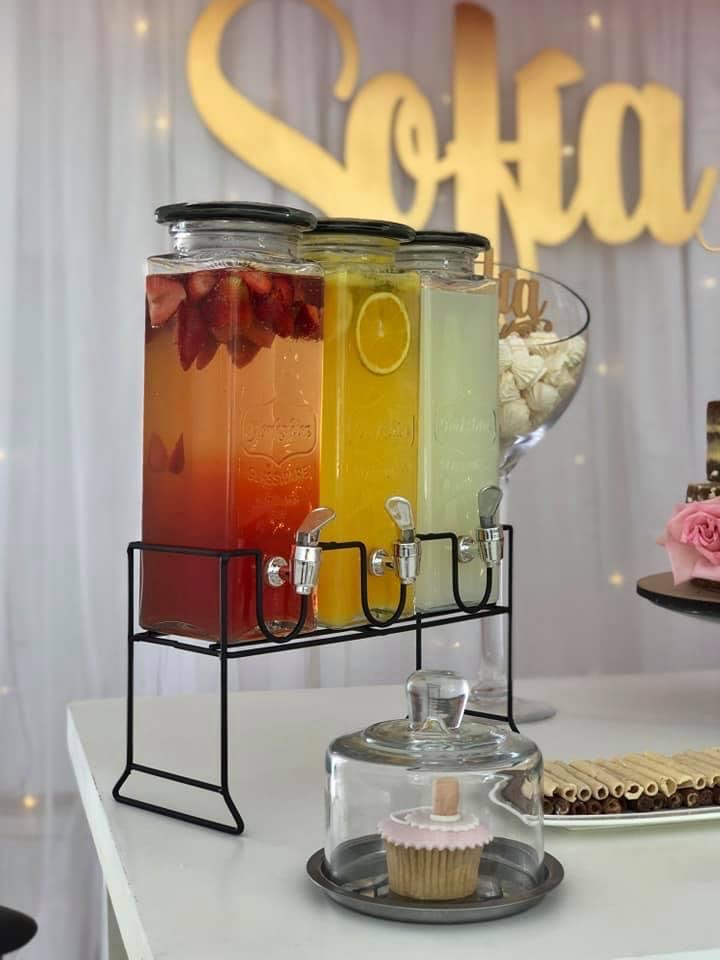 Set dispensador con base metálica y 3 contenedores de vidrio con capacidad de 2.5L cada una