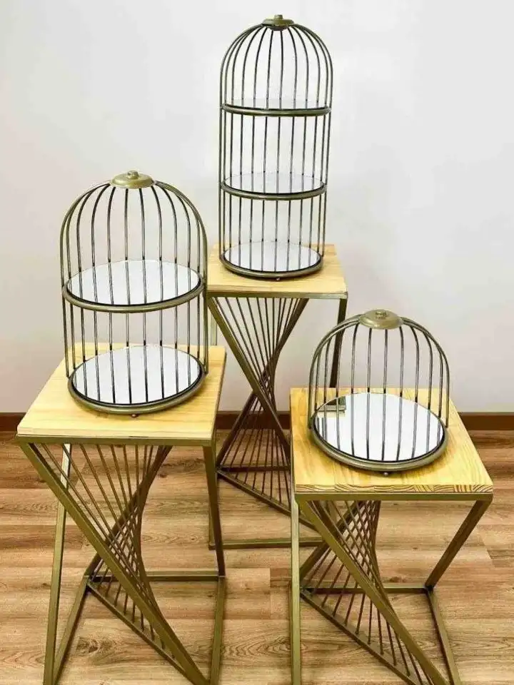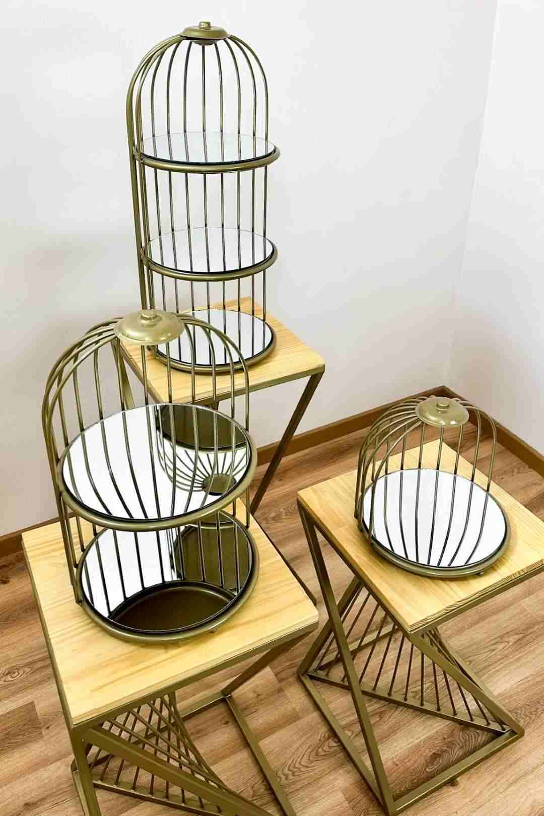 Stands de repostería metálico con espejos, diseño JÁULA DE PÁJARO. Medidas 70, 50 y 30 cms de alto x 33 ancho