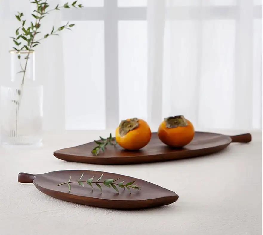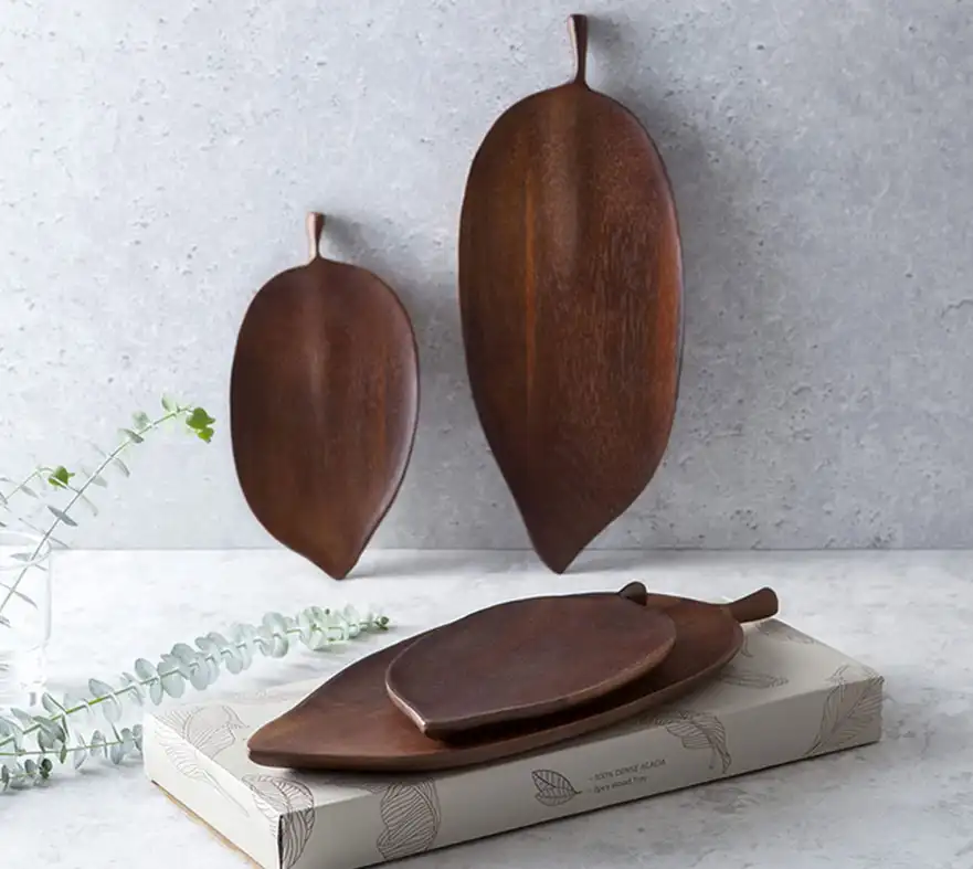 Set Plato bandeja de madera de acacia diseño de hoja de 37.5 cms. (grande) y 24,5 cms. (pequeña).