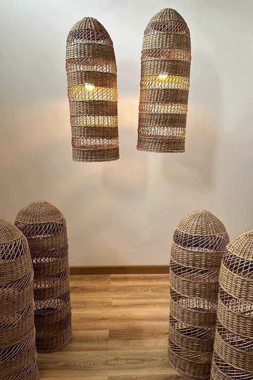 Lámparas de mimbre, diseño flauta de 28 cms de diámetro x 80 cms de alto