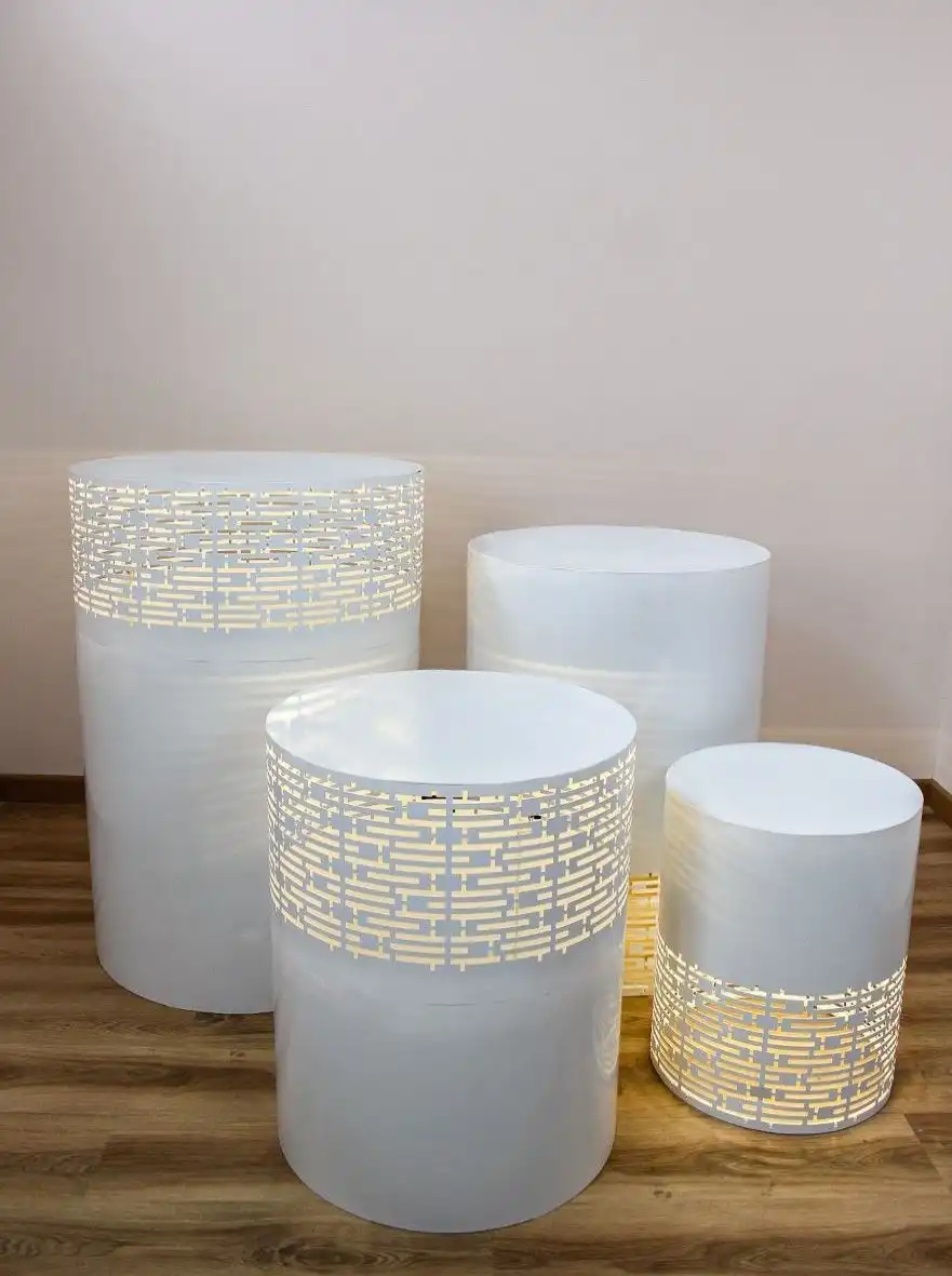 Set de 4 Cilindros en lámina de acero, diseño TROQUELADO, luces LED inalámbrica, color blanco