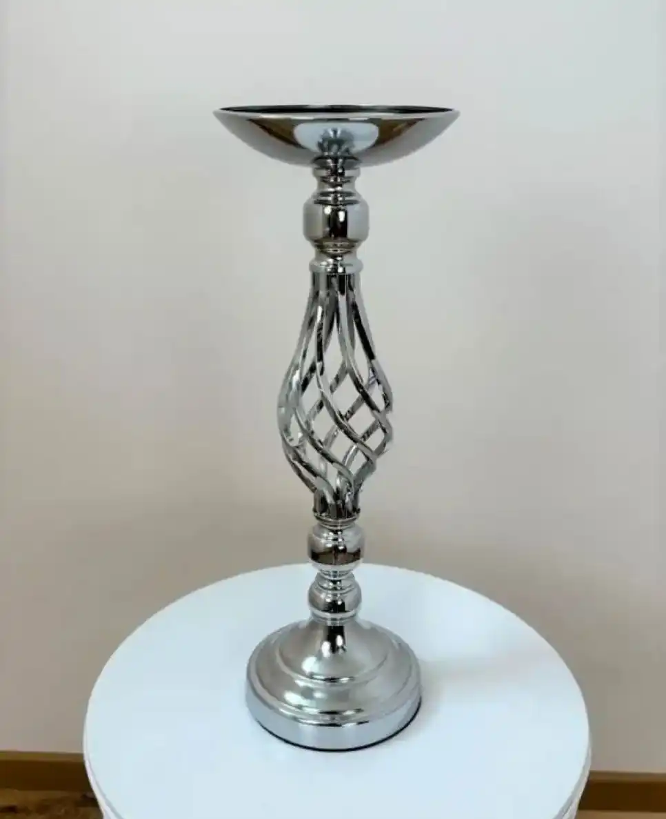 Candelabro / Centro de Mesa metálico, Diseño TRENZADO color plateado. Medias 14 x 48 cms. (ancho x alto)