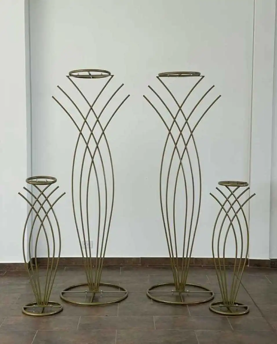 Candelabro / Centro de Mesa metálico, Diseño TRENZADO color oro. Medias 14 x 48 cms. (ancho x alto)