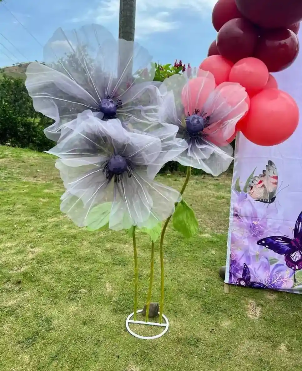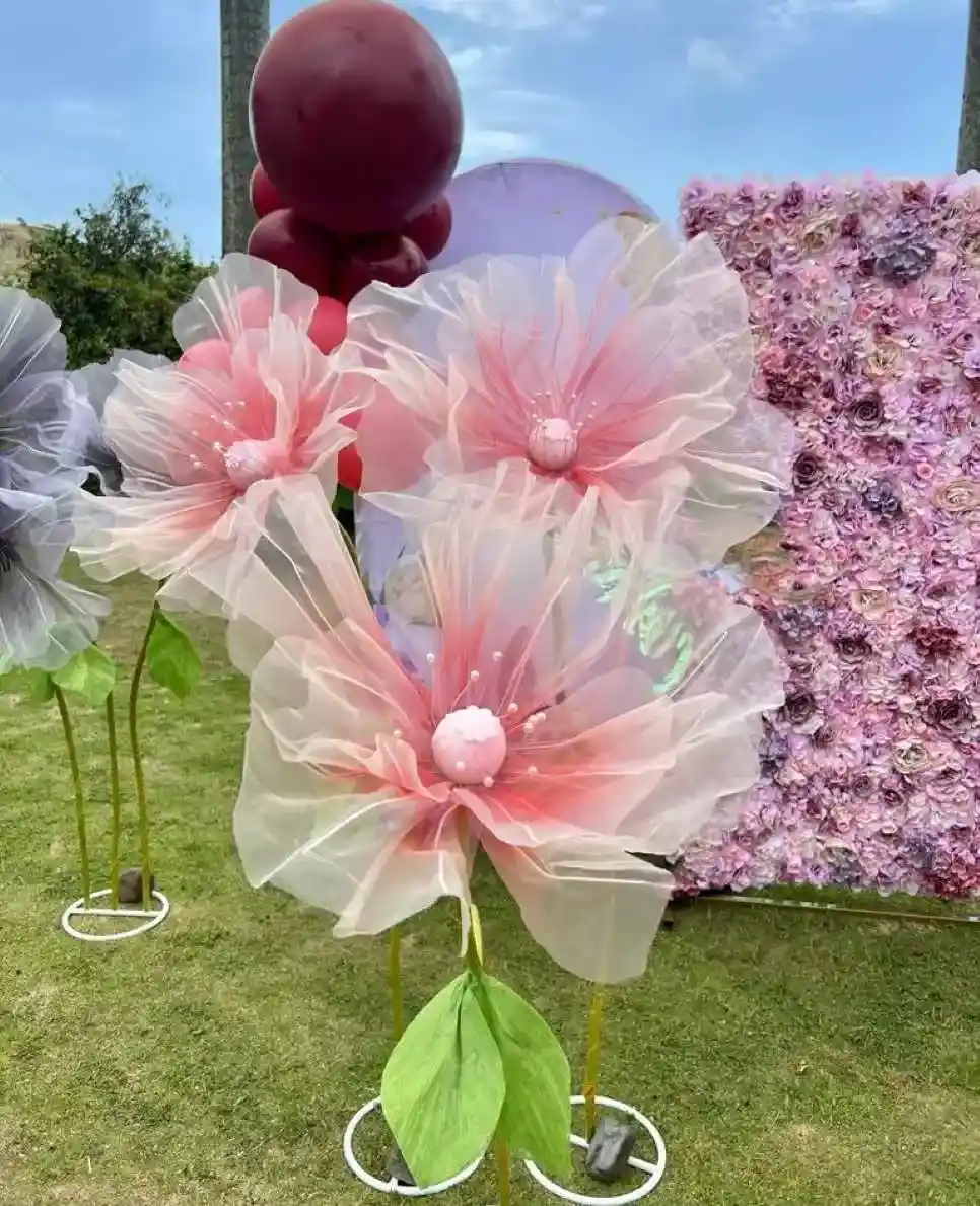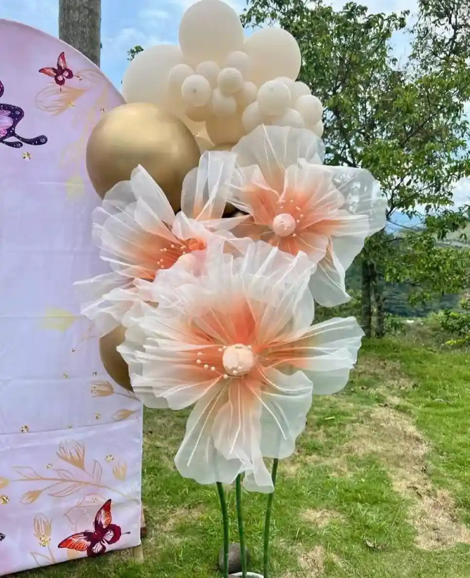 Flores de Organza en colores azul celeste, violeta, naranja y durazno (3 de cada color)